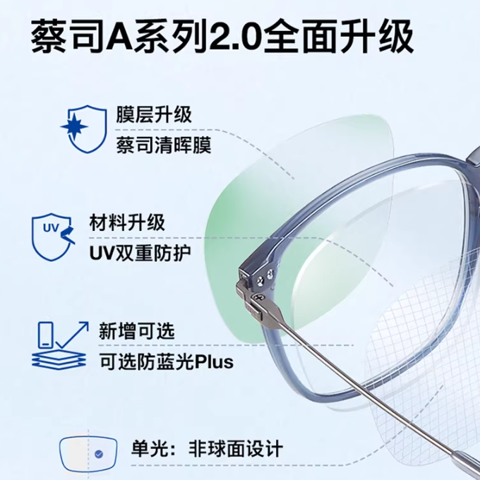• 蔡司A系列2.0单光1.60非球防蓝光plus清晖膜成镜